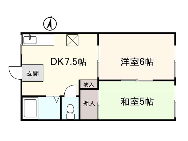 | 詳細間取 | 2DK (洋6帖×1、和5帖×1、DK7.5帖) | ||