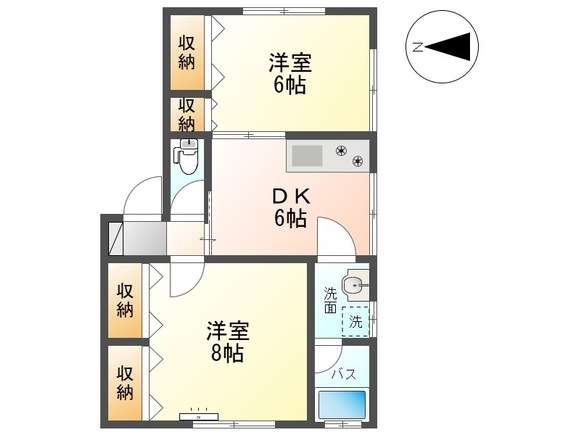 | 詳細間取 | 2DK (洋6帖×1、洋8帖×1、DK6帖) | ||
