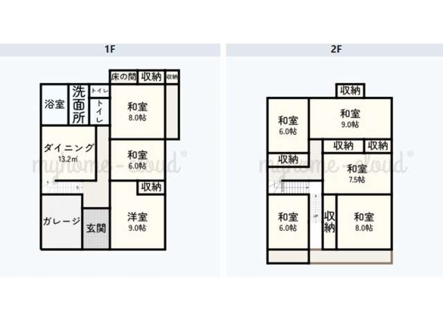 | 詳細間取 | 8DK (1階:和6帖×1、1階:和8帖×1、1階:洋9帖×1、2階:和6帖×2、2階:和7.5帖×1、2階:和8帖×1、2階:和9帖×1、1階:DK8帖) | ||