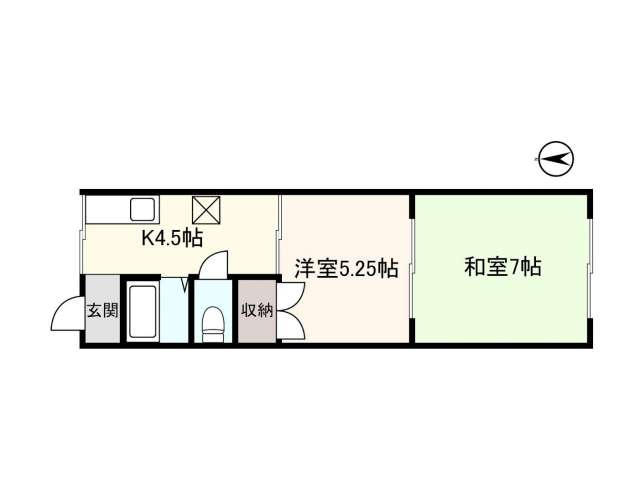 | 詳細間取 | 2K (洋5.25帖×1、和7帖×1、キッチン4.5帖) | ||