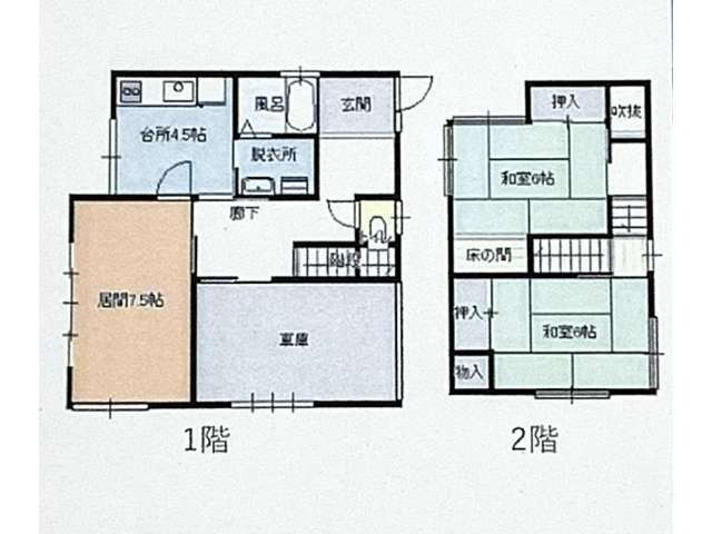 | 詳細間取 | 3DK (1階:洋7.5帖×1、2階:和6帖×2、DK4.5帖) | ||